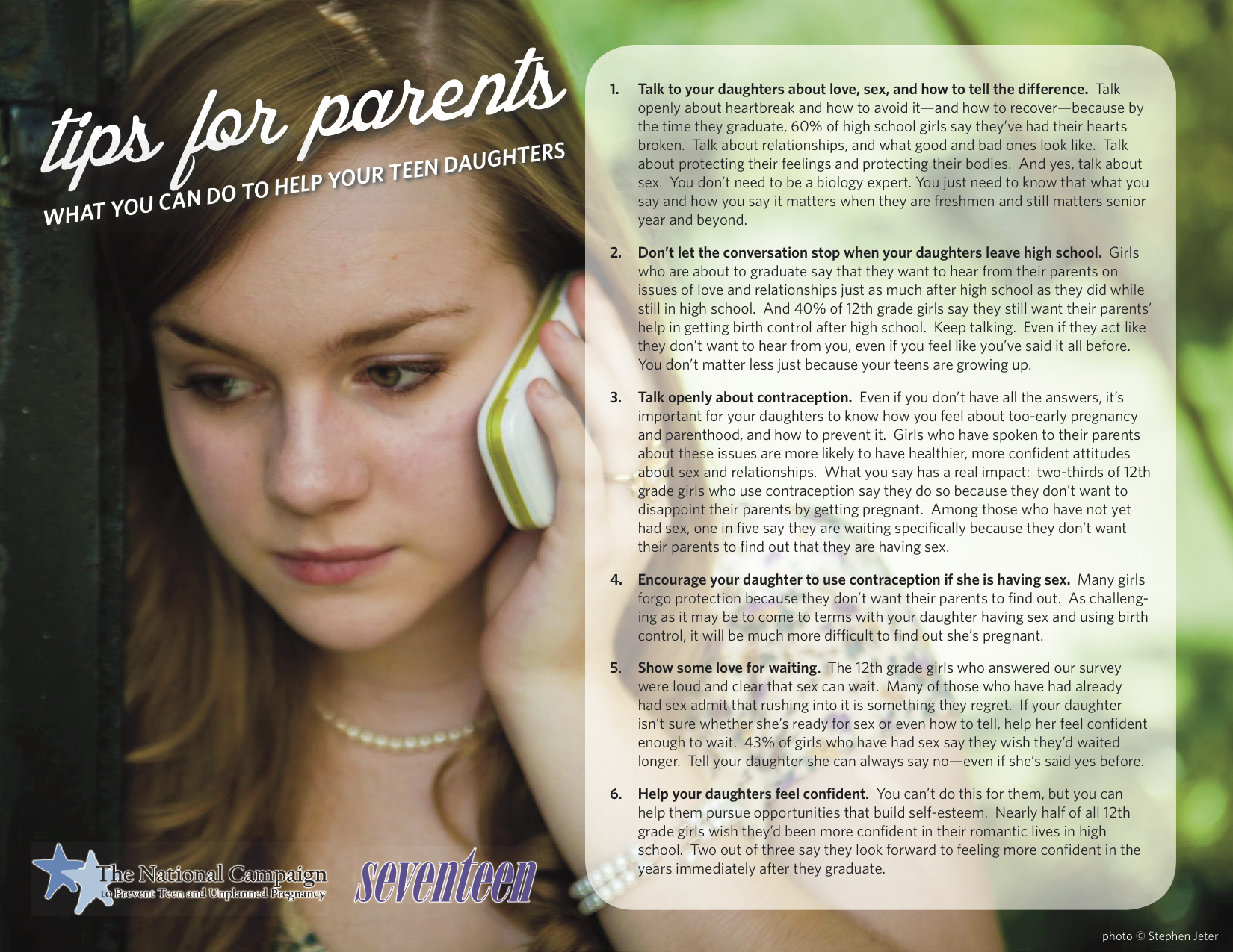 Girls who have open, honest conversations with parents about love, sex, and relationships, heartbreak, dating, etc. are more likely to have healthier, more confident attitudes about sex and relationships. If these are tips you would like to share with your parents, do so and keep talking!